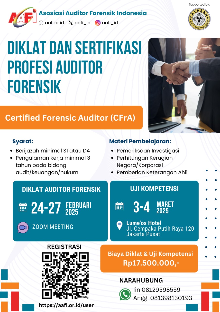 Asosiasi Auditor Forensik Indonesia Endokisi (AAFI ENDOKISI), dengan dukungan dari Yayasan Cakra Bhakti Santosha, kembali mengadakan Diklat dan Sertifikasi Profesi Auditor Forensik dengan gelar Certified Forensic Auditor (CFrA). Program ini bertujuan untuk meningkatkan kompetensi para auditor dalam bidang audit investigatif dan forensik guna mendukung upaya pemberantasan tindak pidana keuangan dan korupsi.